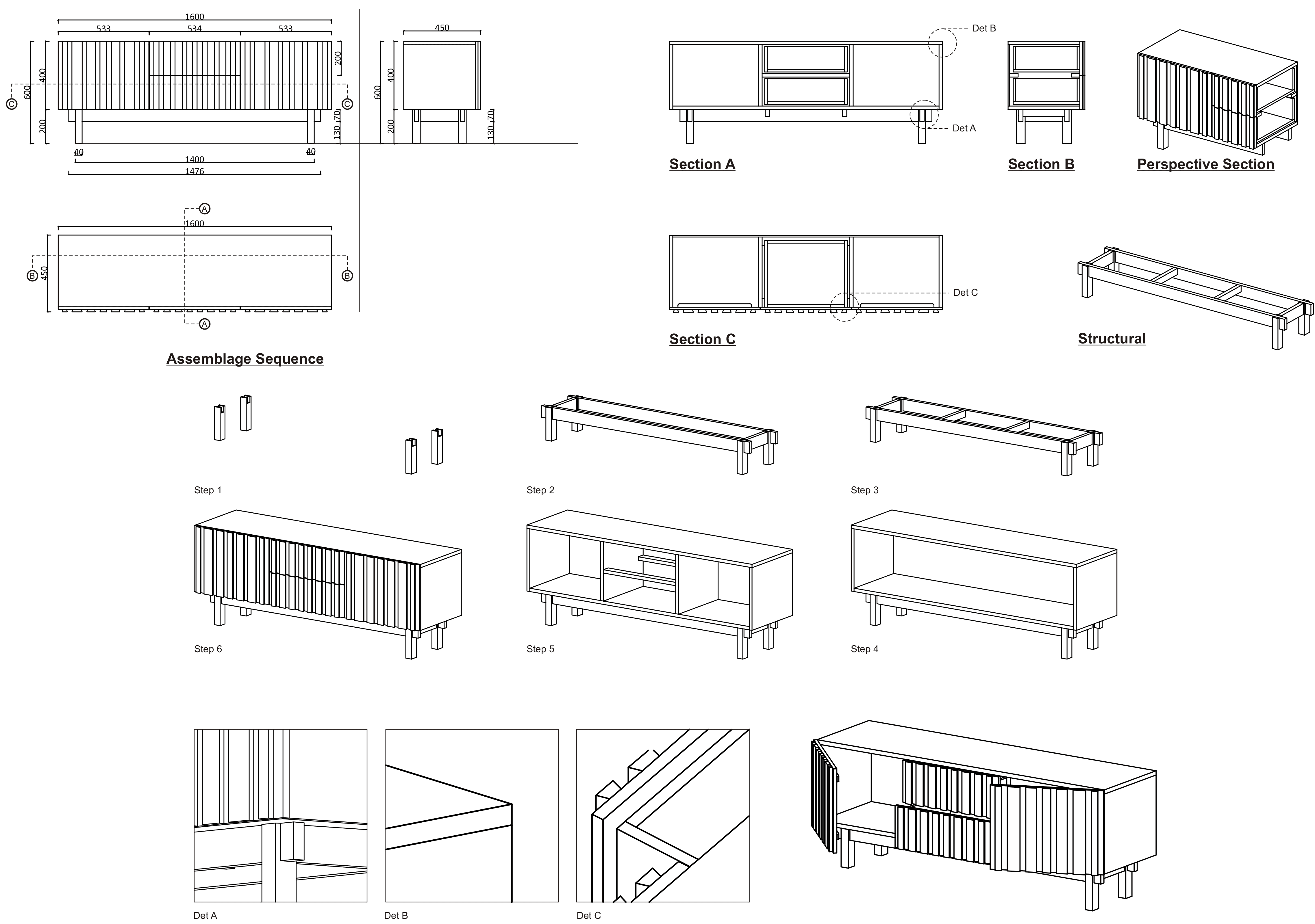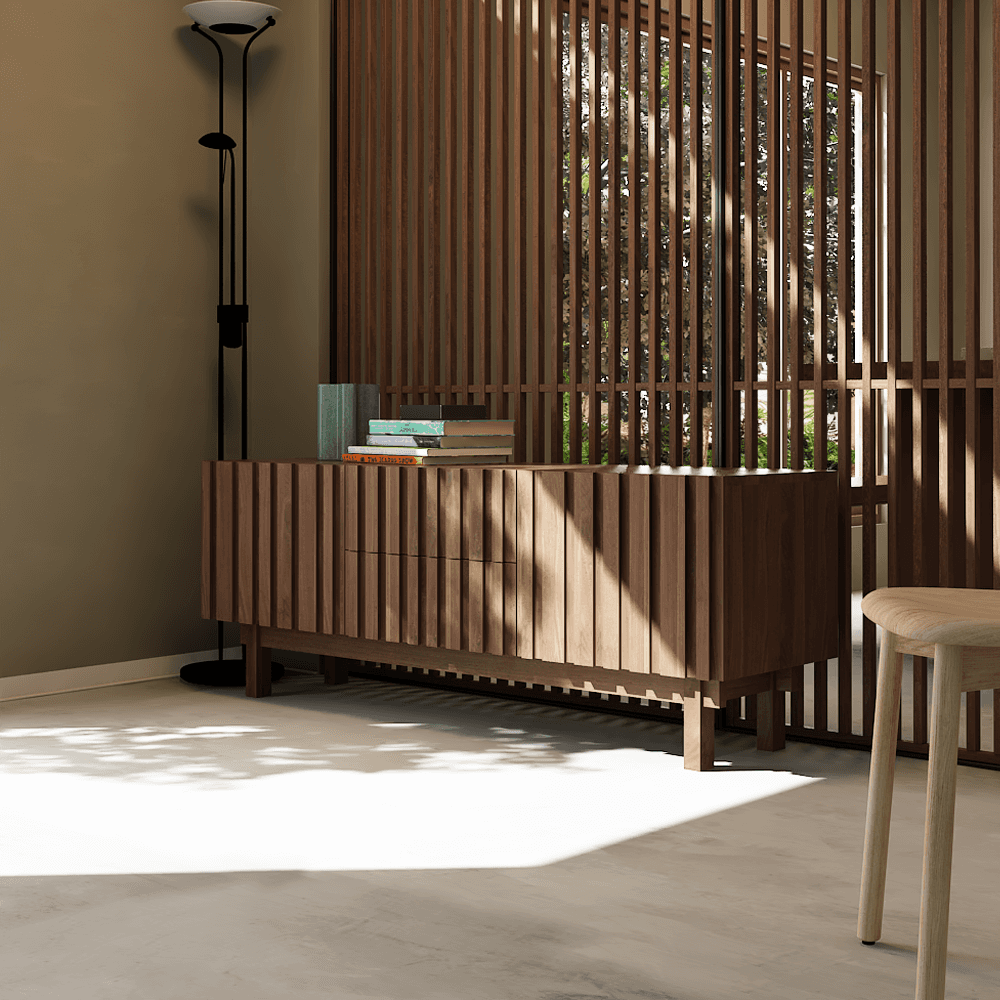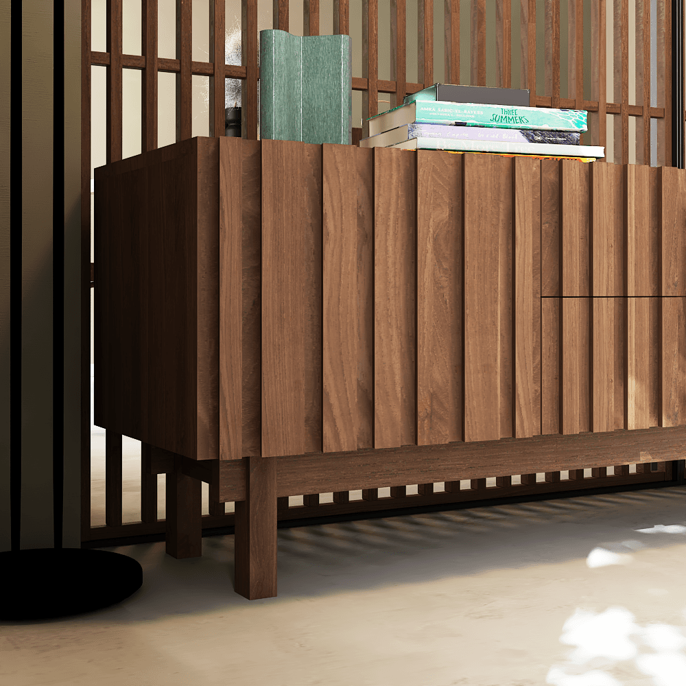 Designer • Product Visualization The Saron Credenza is a tribute to Indonesian heritage, translating the acoustic rhythm of the Gamelan into functional form. Its vertical slatted facade mimics the wilangan (bronze bars) of the Saron instrument, creating a rhythmic visual "tempo" across the unit. Blending sculptural quality with industrial precision, the design features: Narrative Design: A tactile translation of traditional musical components into a modern silhouette. Refined Hardware: Integrated soft-close "Engsel Sendok" hinges and 350mm soft-roller tracks for a fluid user experience. Modular Assembly: A sophisticated sequence designed for modern efficiency without compromising the aesthetic. This piece explores the intersection of cultural storytelling and technical craftsmanship, resulting in a furniture unit that is as harmonic as the music that inspired it.