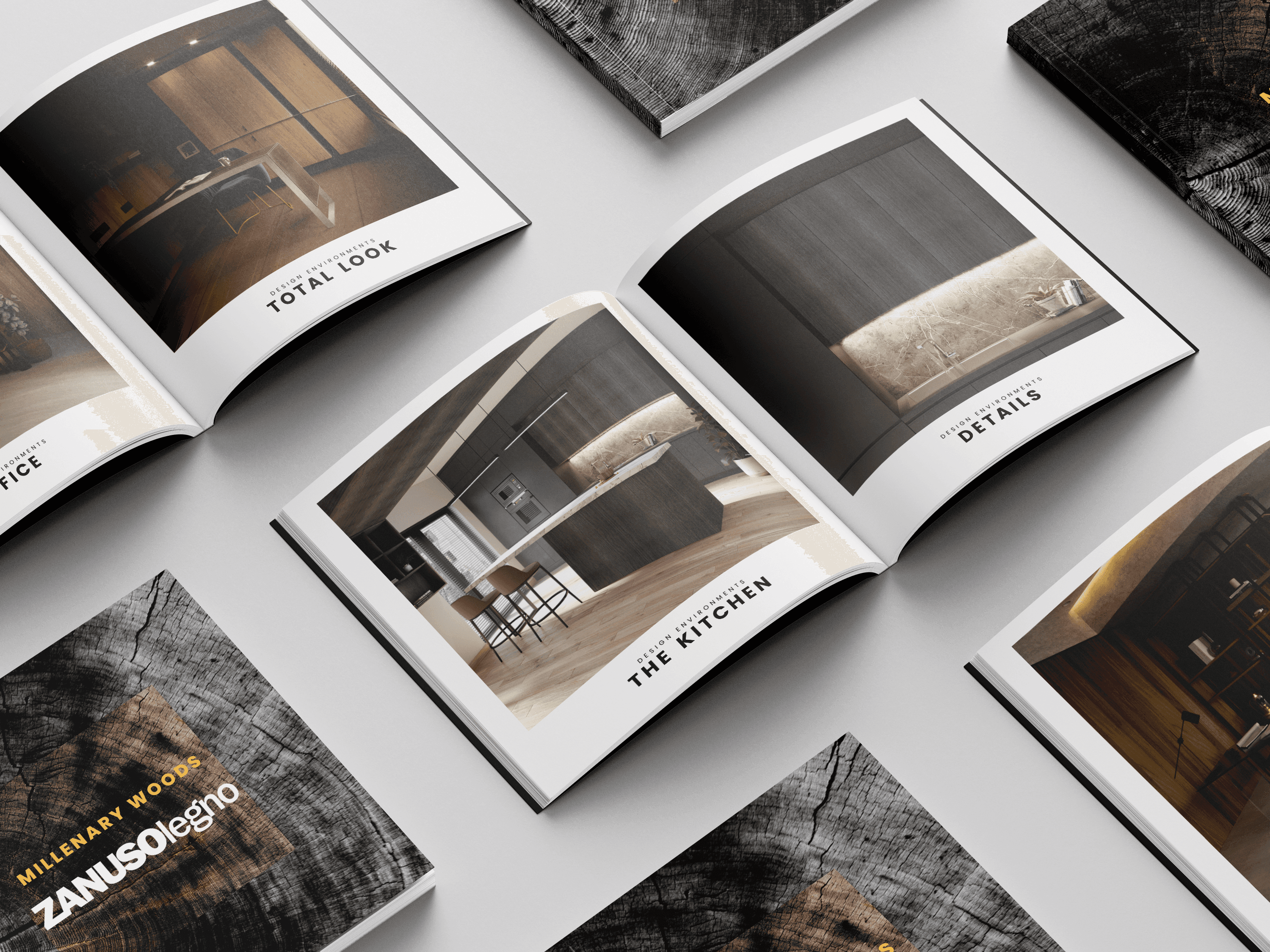 Product catalog design Interior renderings featuring Zanuso Legno materials High-resolution images for marketing and presentation